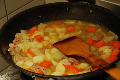 大概再炒個3分鐘~加入一公升的水^^~(大概蓋過所有材料就行~多一點也無所謂)